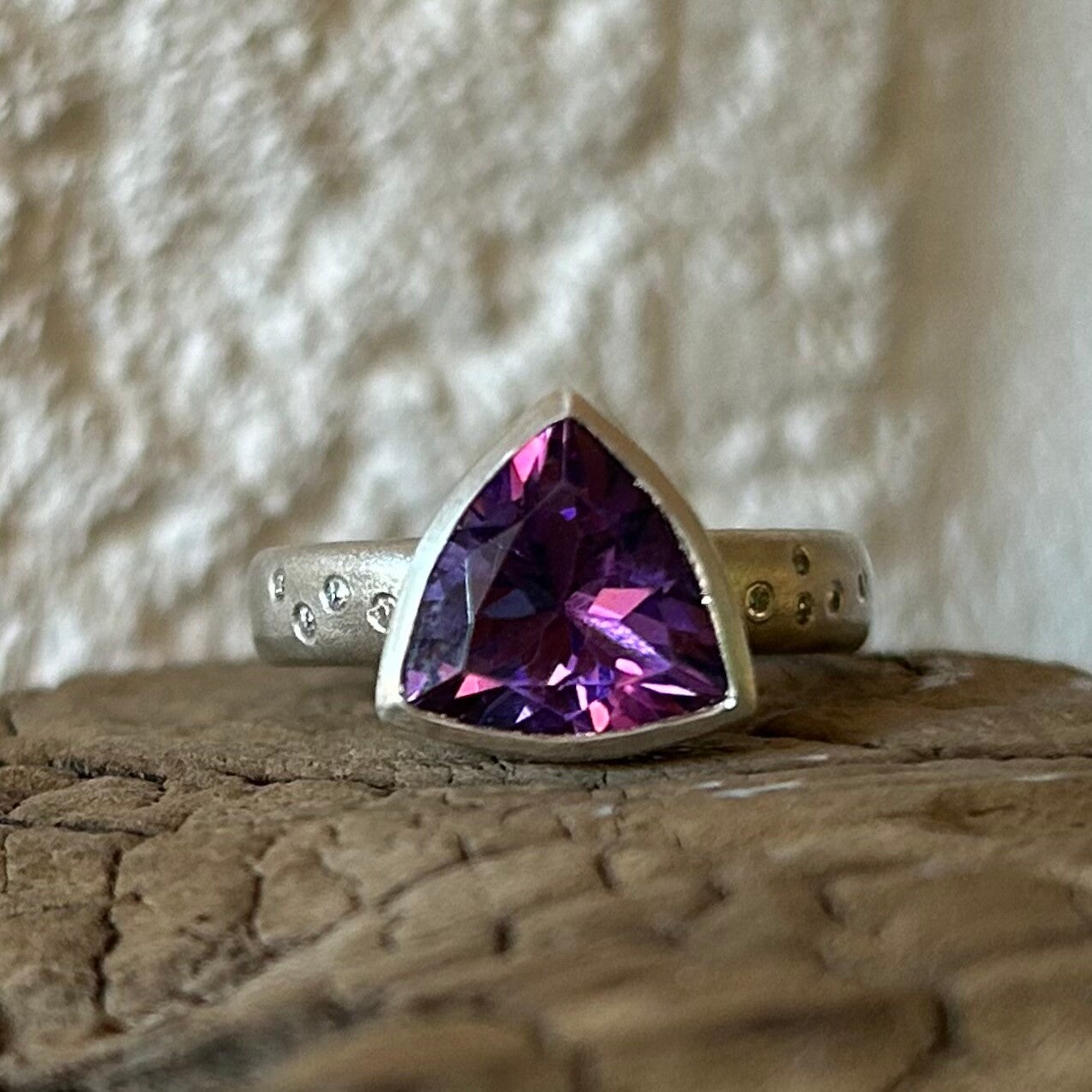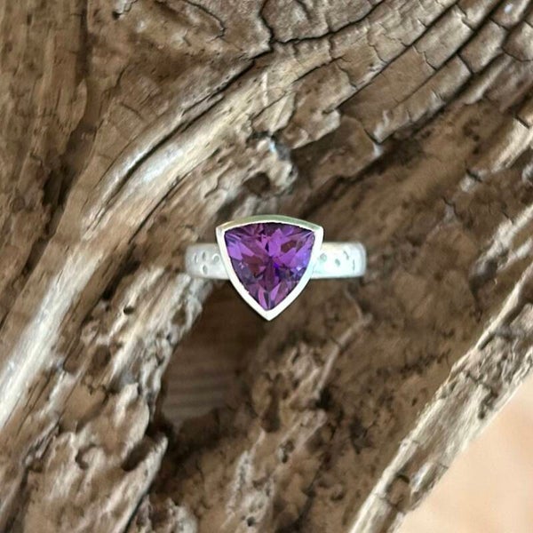 This Amethyst cocktail ring is a real Bobby Dazzler! A 10mm trillion cut amethyst in a wide oval band. Set with diamonds scattered on the setting and band this is a real statement piece.