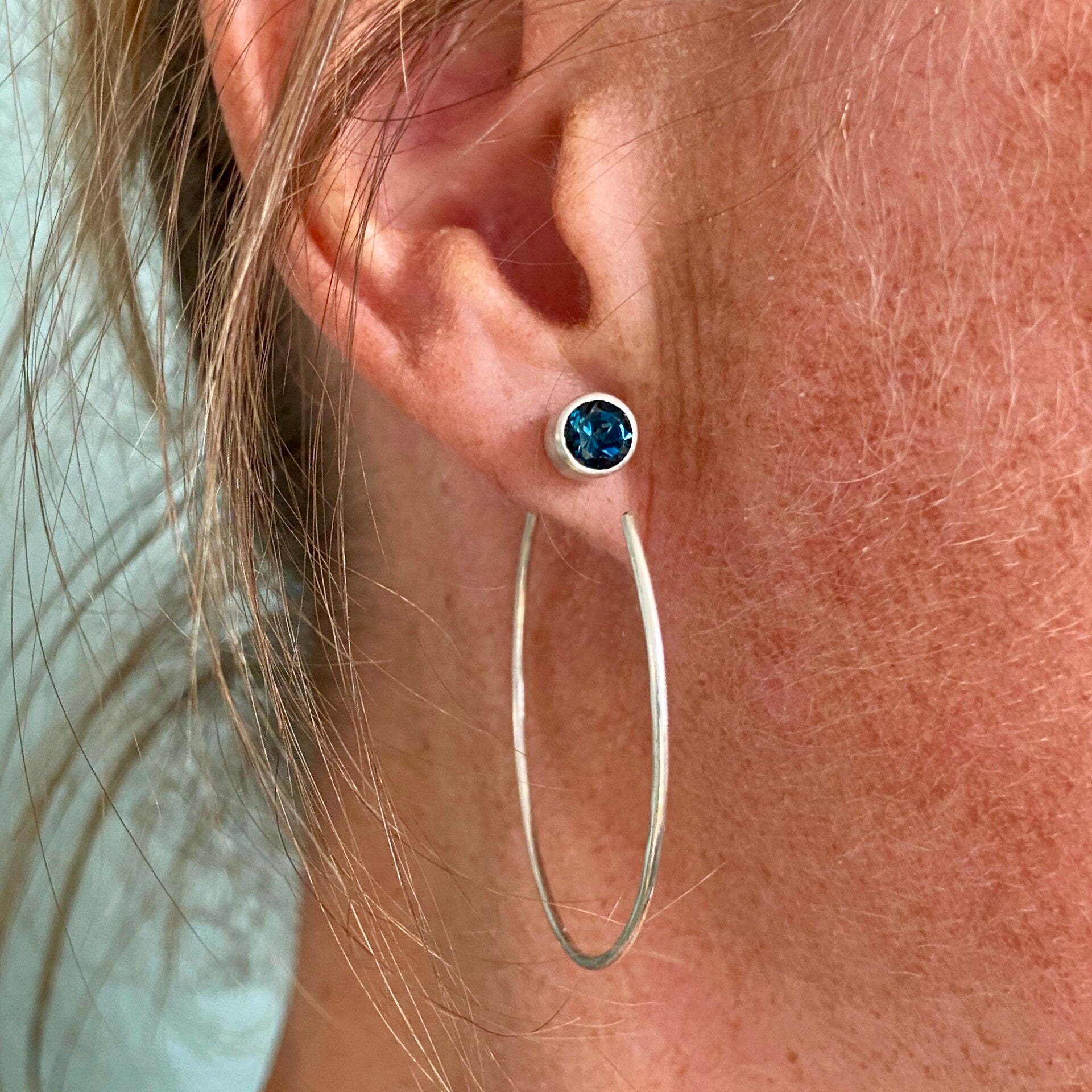 Each earring features a slim, hand-formed silver hoop accented by a bezel-set London blue Topaz at the end, adding a bright pop of deep blue.