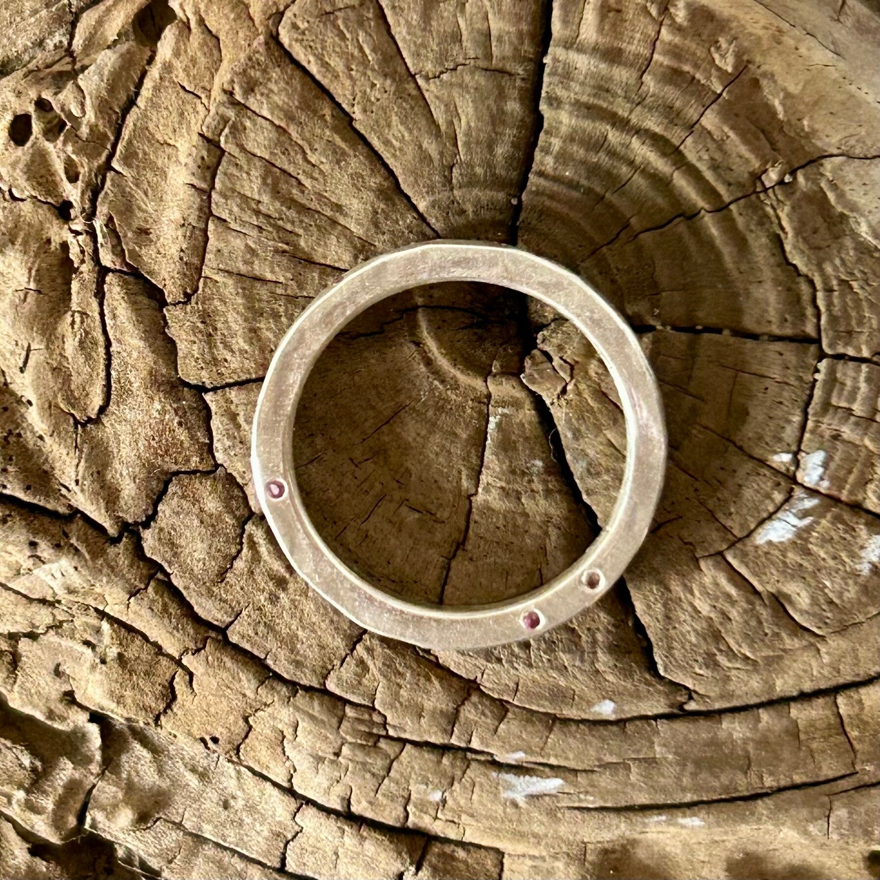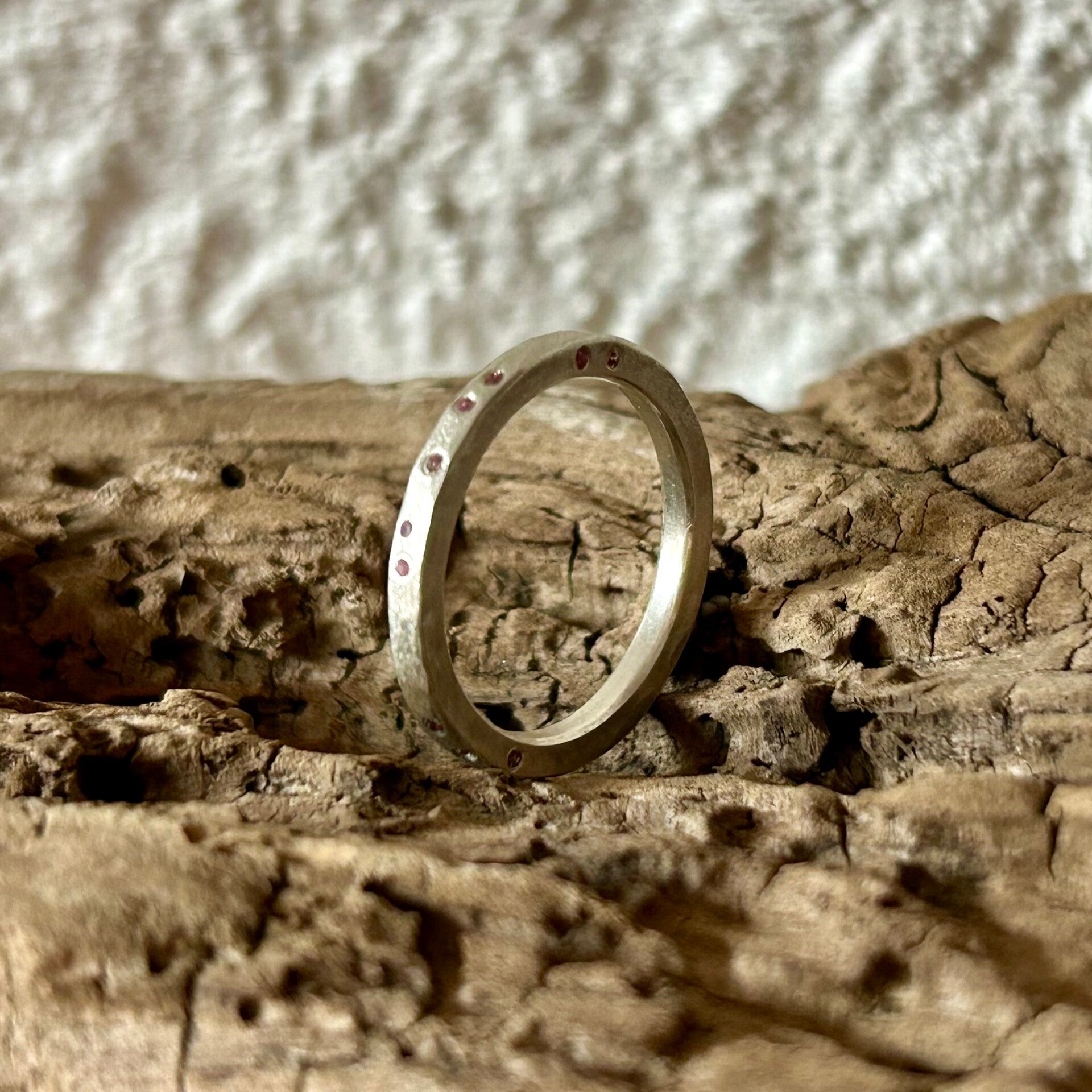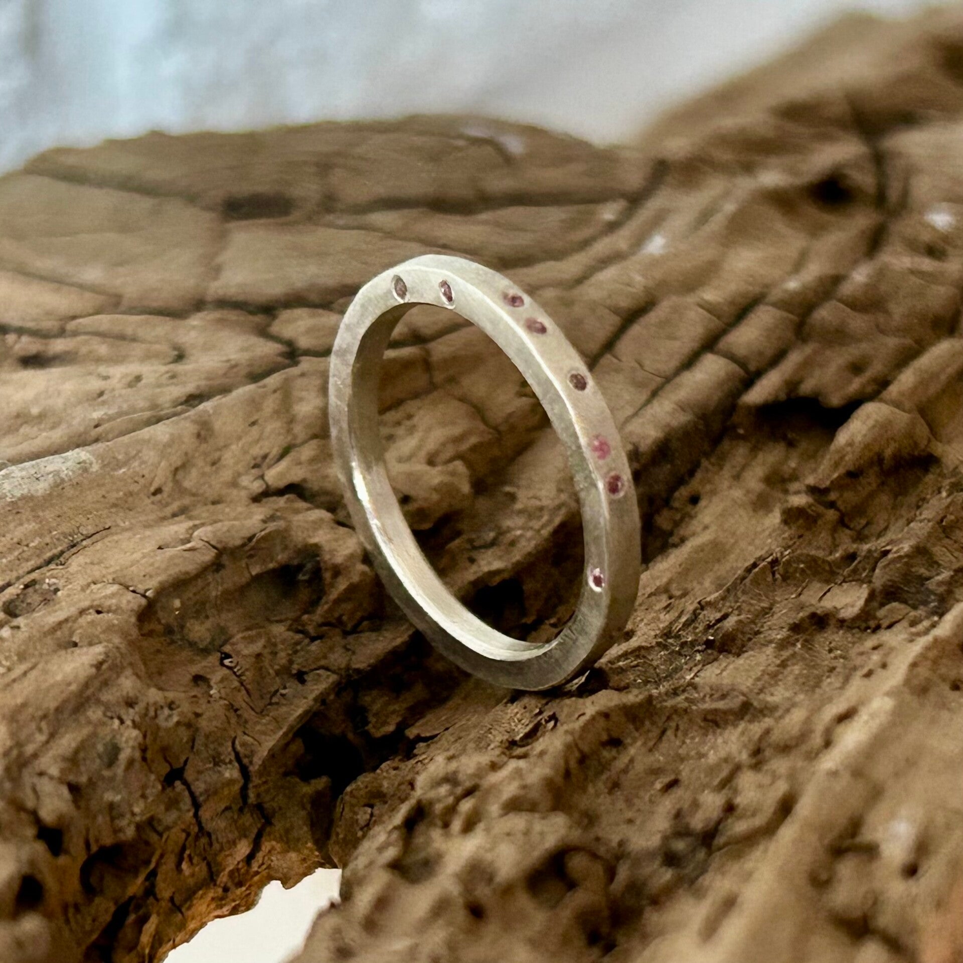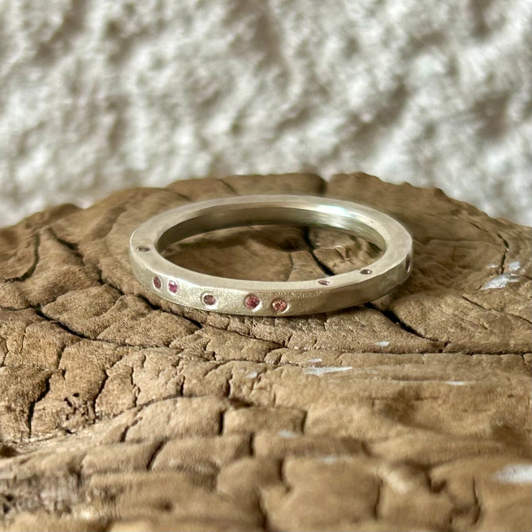 Scattered around the band are tiny, flush-set sapphires in subtle pink and champagne tones, adding gentle flashes of color without overpowering the minimalist design.